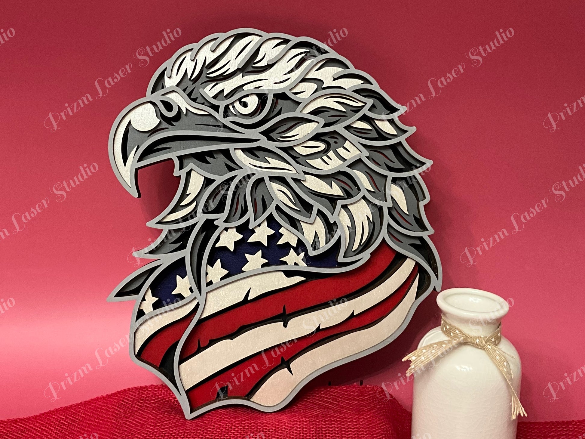 Celebrate American pride with the Patriotic Eagle, a stunning 3D layered laser-art piece crafted from stained and painted plywood. Measuring approximately 10 inches by 10.5 inches and weighing about 12 ounces, this compact wall art delivers bold impact without occupying precious space.